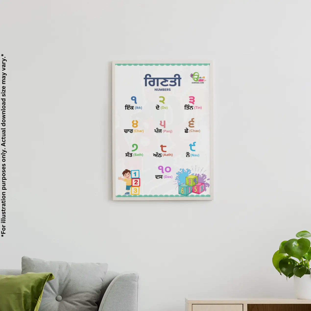 Buying this chart is quick and easy, with no waiting and no shipping. Once purchased, you can instantly download the digital PDF, print it in your preferred size, and start using it right away. You can laminate it for durability or frame it as part of your child’s learning corner. Teachers can display it on classroom walls, study boards, or use it as a visual aid during lessons and activities. This chart also works well alongside other fun learning tools, like coloring activities or matching games, helping children reinforce what they see on the chart while practicing colours name in English and Punjabi.